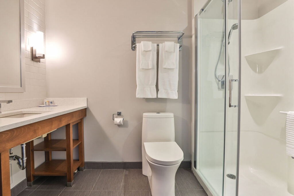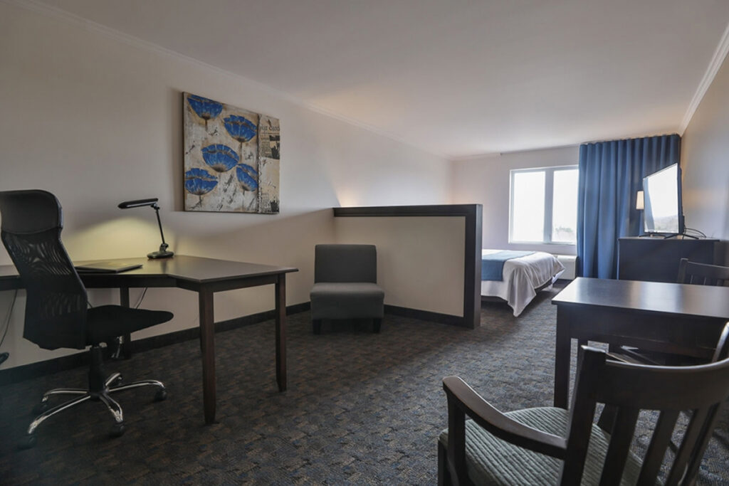 Avec sa superficie de 36 m², la suite affaires peut loger jusqu’à 4 personnes avec un lit king ou deux lits queen. Elle offre une salle de bain avec baignoire-douche combinée et un coin cuisinette avec lavabo.