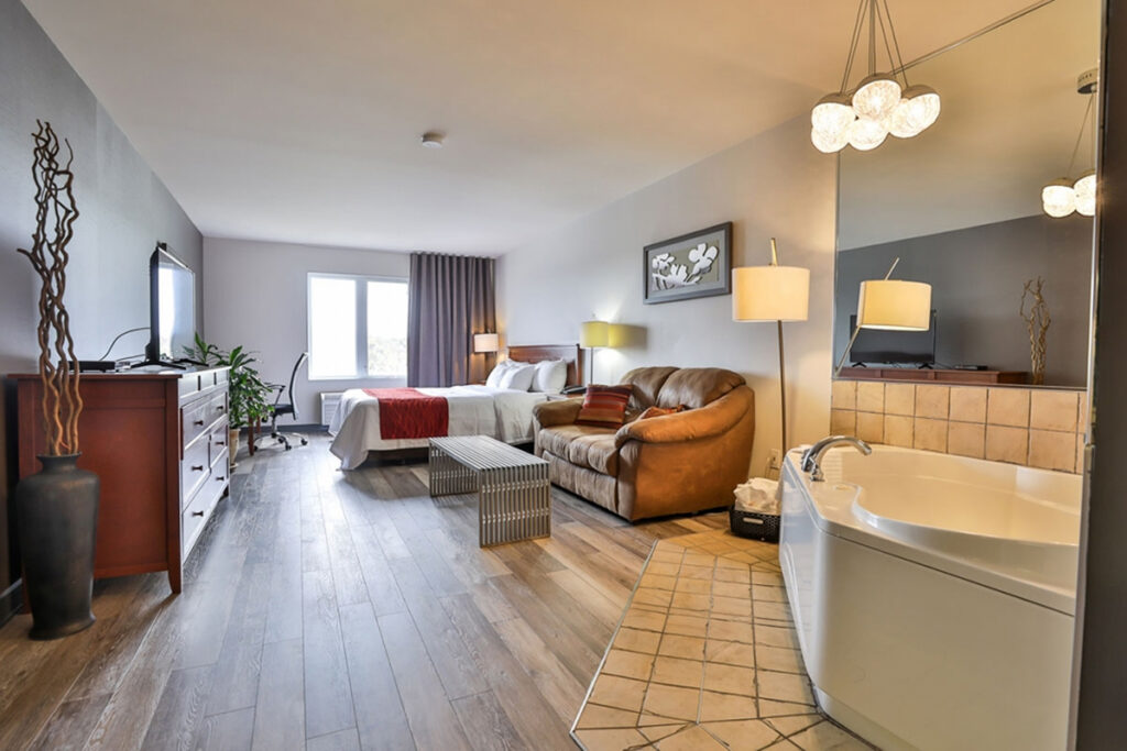 Pensée pour deux, la suite tourbillon s’étend sur 36 m² et comprend un lit king, une salle de bain avec baignoire-douche combinée, ainsi qu’un bain tourbillon privé dans la chambre. Elle dispose aussi d’un coin cuisinette avec lavabo.